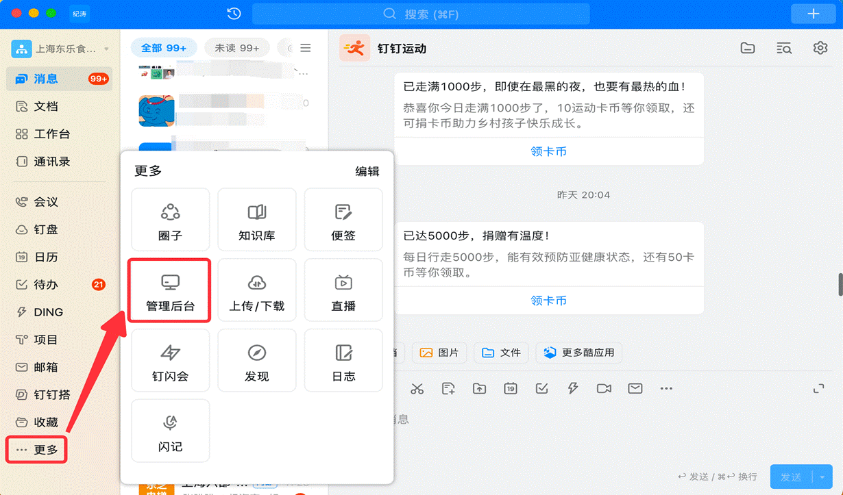 # 1、在钉钉客户端左侧菜单【更多】,进入【管理后台】