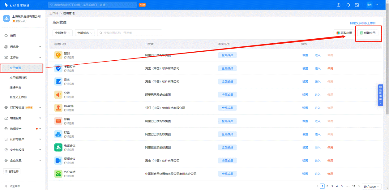 # 2、在【工作台】-【应用管理】中,选择【创建应用】