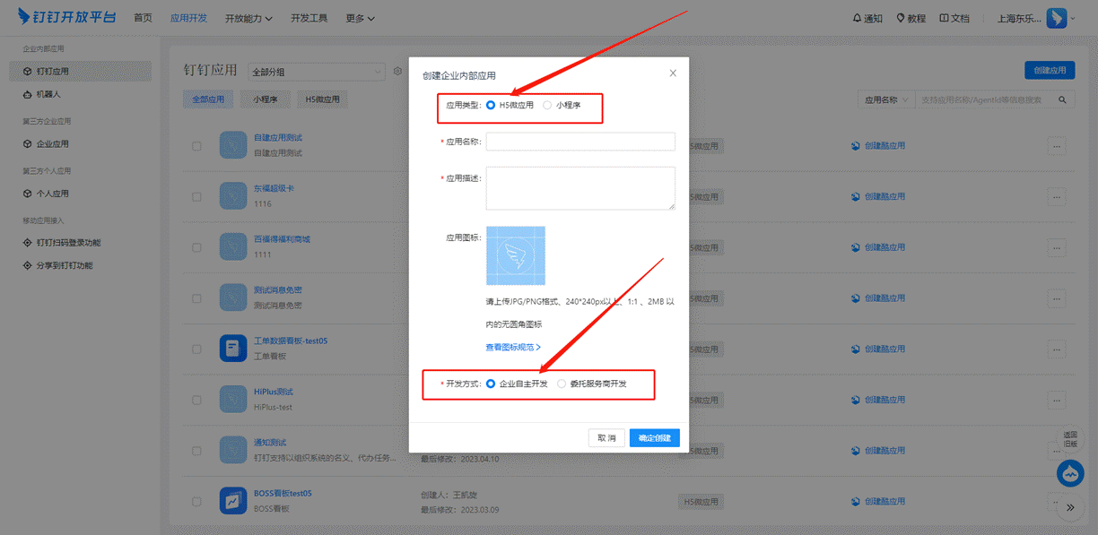 # 3、在【创建企业内部应用】选择【应用类型】-【H5微应用】,将“应用名称”、“应用描述”、“应用图标”维护后,【开发方式】选择【企业自主开发】创建应用