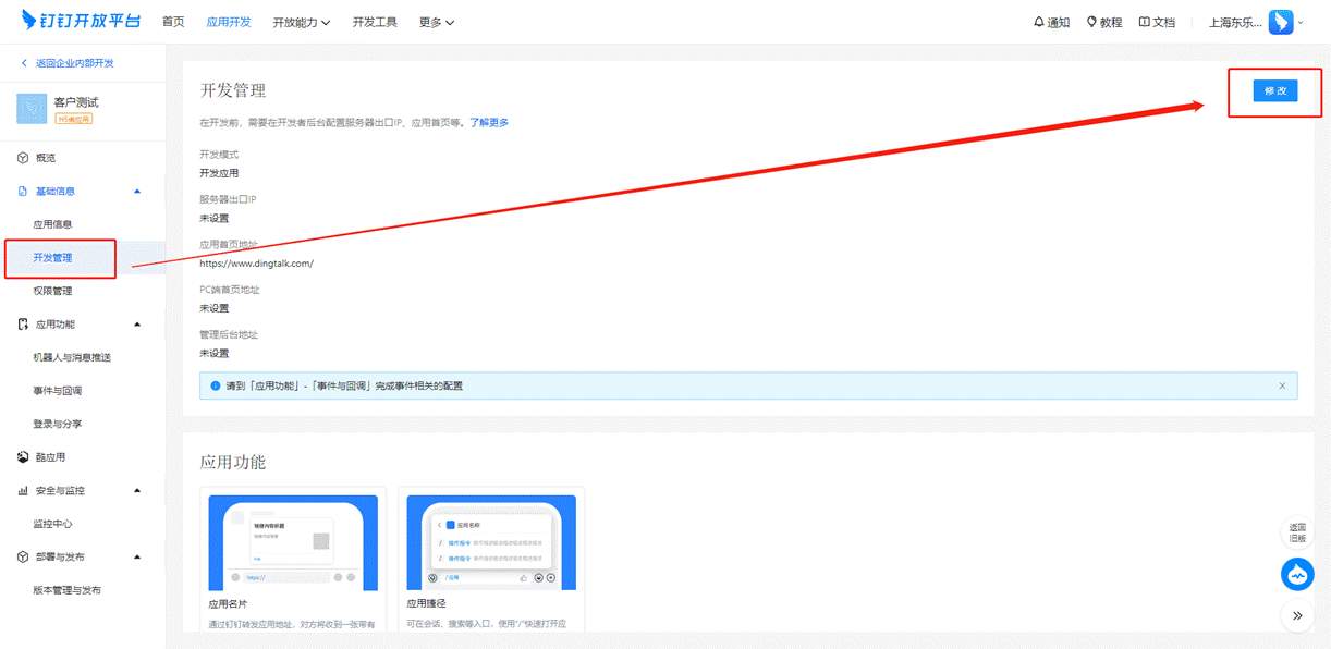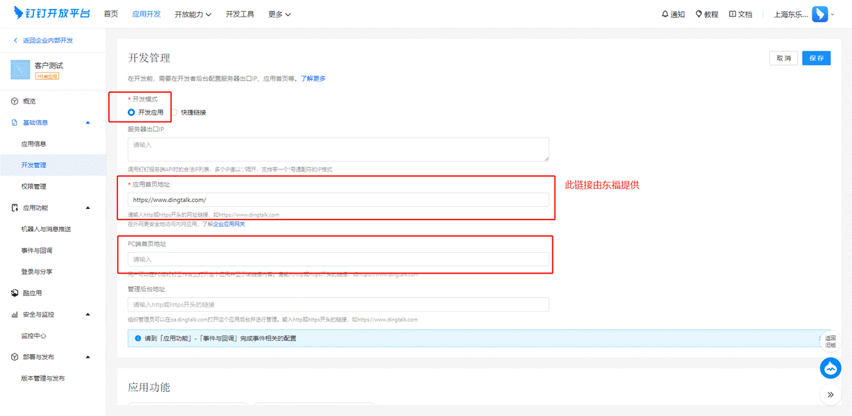 # 2、开发管理中【开发模式】选择【开发应用】填写【应用首页地址】(注:首页跳转地址由东福提供)