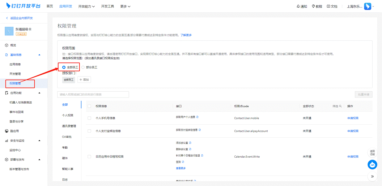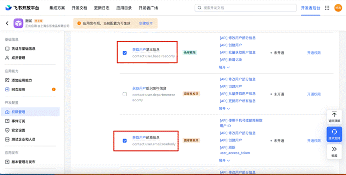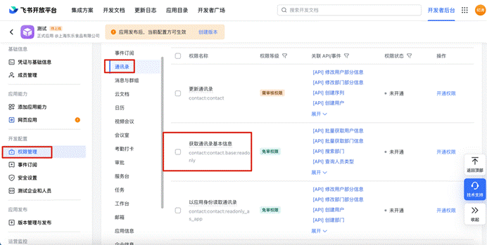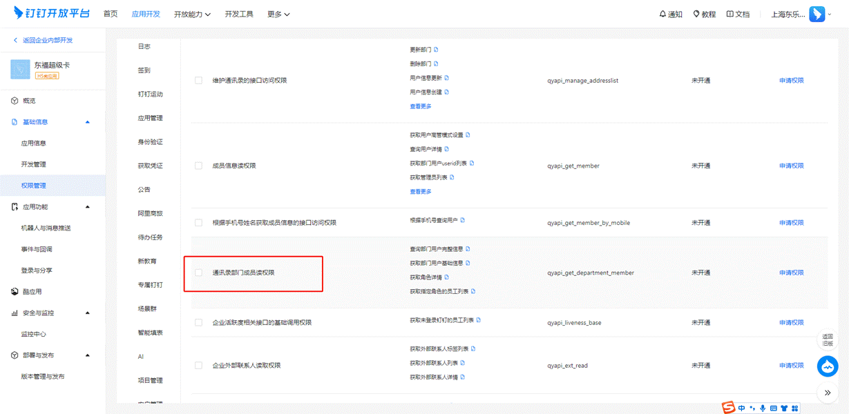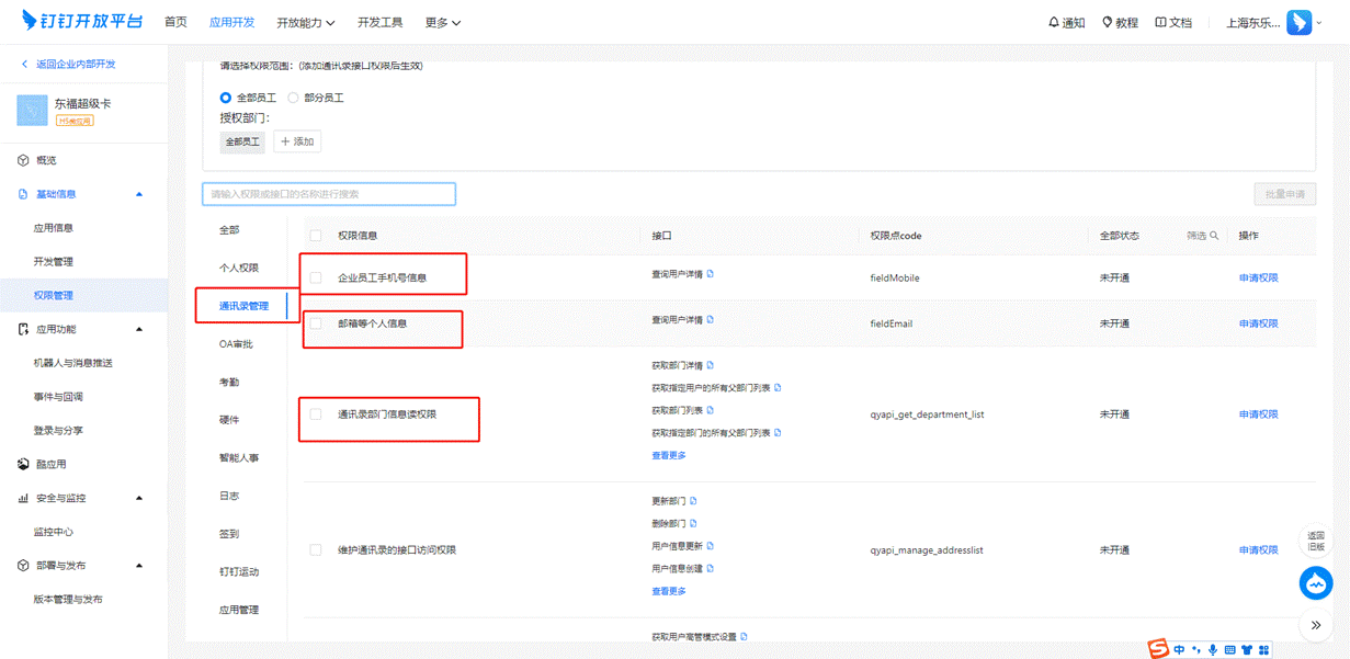 # 2、 【权限管理】中选择【通讯录管理】开通权限信息选择“企业员工手机号信息”、“邮箱等个人信息”、“通讯录部门信息读权限”、“通讯录部门成员读权限”