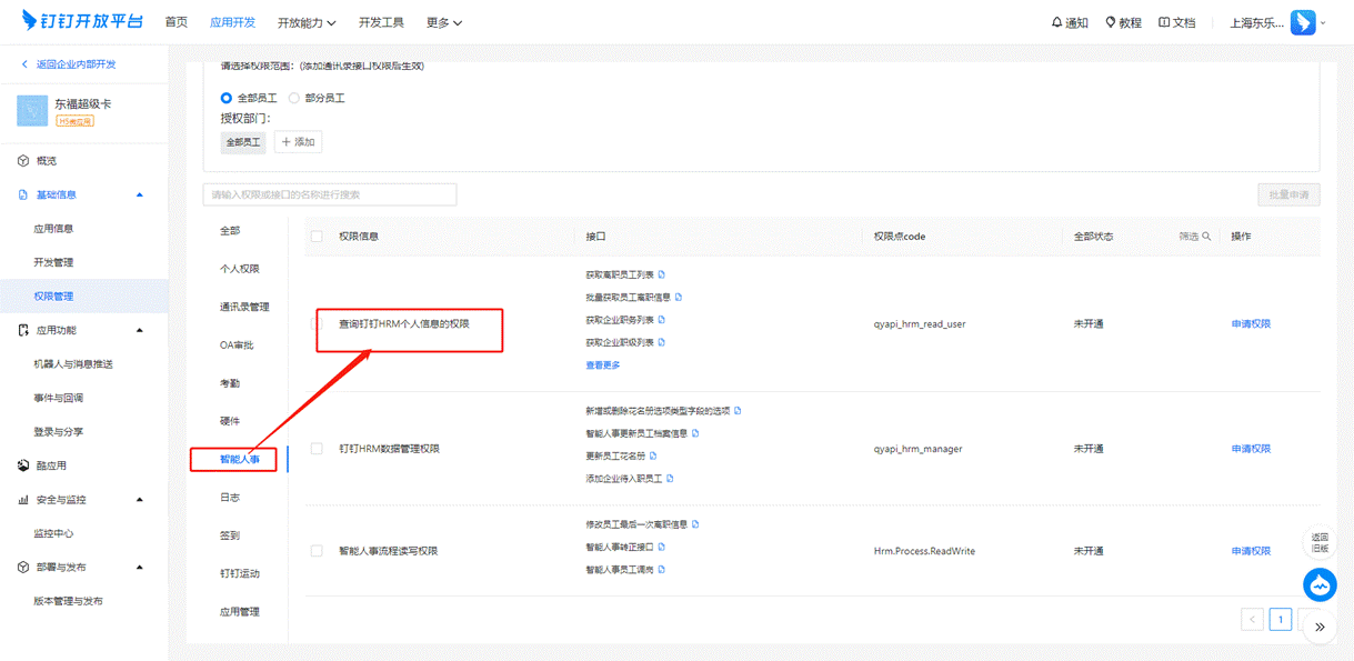 【注】如同步字段超出【姓名】【手机号】【工号】【职位】【邮箱】【入职时间】【直属主管】【分机号】【司龄】【备注】【办公地址】例如同步生日、性别、证件号,需开通下图所示的“查询钉钉HRM个人信息的权限”。证件类型、证件号、性别等字段需要现在钉钉工作台-智能人事-花名册里面进行维护,字段维护完成之后将HRM个人信息的权限开通。