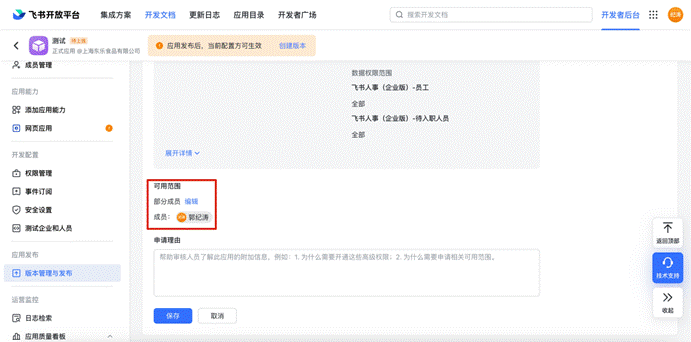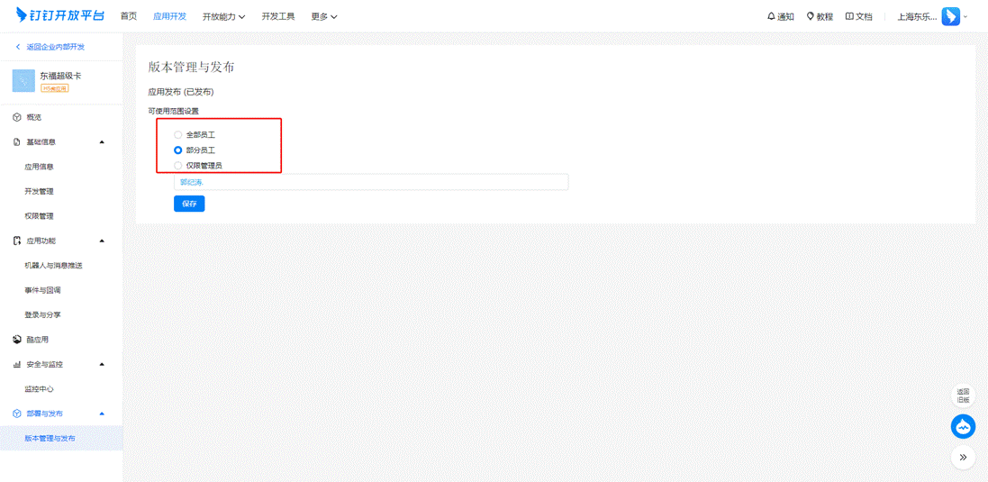 注:根据客户情况,按照下图所示设定应用可使用的员工范围。(如前期小范围测试,可指定部分人员使用,测试通过后再设置为全部员工)