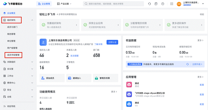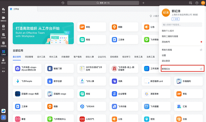 # 1、在飞书客户端个人信息菜单,进入【管理后台】