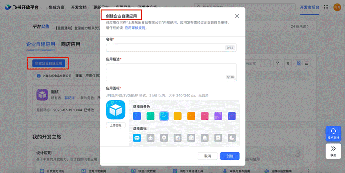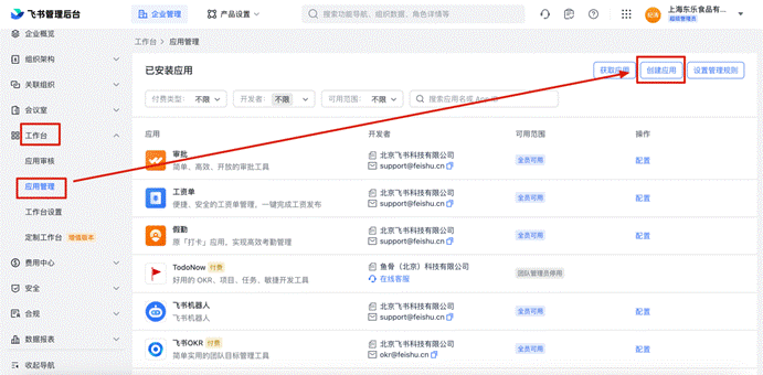 # 一、客户飞书管理员打开飞书管理后台创建应用