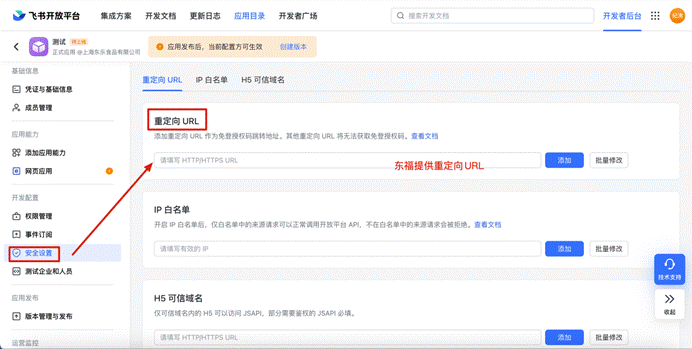 # 四、客户完成安全地址-重定向URL 配置(重定向URL链接由东福提供)