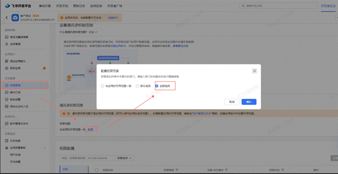 # 1、选择【权限管理】配置通讯录权限范围,选择与应用的可见范围一致【设置】,选择【全员成员】