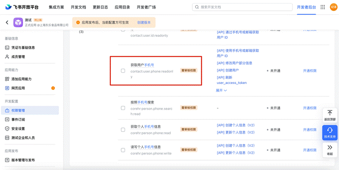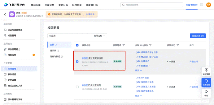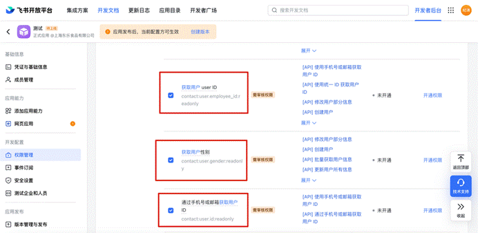 # 1、权限配置,选择【通讯录】配置通讯录:“以应用身份读取身份读取通讯录”、“获取用户基本信息”、“获取用户邮箱信息” 、“获取用户UserId”、“获取用户性别”、“获取用户手机号”、“通过手机号或邮箱获取用户ID”