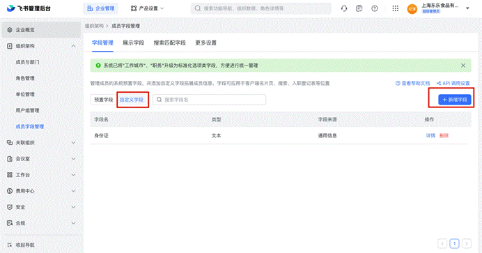 2、场景所需字段超出:“以应用身份读取身份读取通讯录”、“获取应用基本信息”、“获取用户邮箱信息” 、“获取用户UserId”、“获取用户性别”、“获取用户手机号”、“通过手机号或邮箱获取用户ID”、“查询用户职级”、“查询用户工号“、“查询用户所属的工作序列”、“查看成员的虚线上级”、“获取用户受雇信息”则需要创建自定义字段。