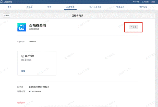 # 3、添加完成后客户会得到一个开发中的自建应用,等待百福得产研开发配置方可启用