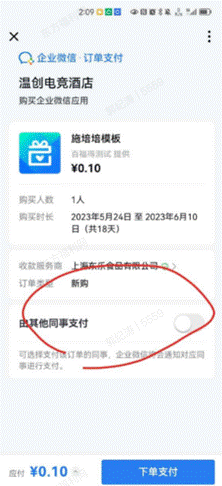 # 2.2、客户收到需要支付的应用订单消息通知,进行订单付款完成(可由企微组织架构中的同事代付)
